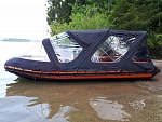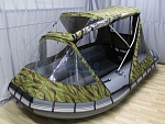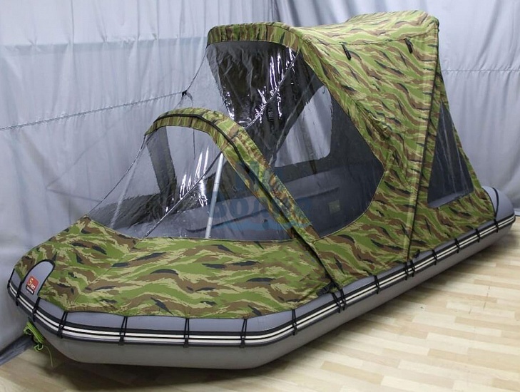 Легкость трансформации: возможность быстро отстегнуть достройку и использовать только носовой тент. Носовой тент также можно использовать, как отдельно от всей конструкции, так и в сочетании с крышей, подняв остальные части тента.