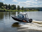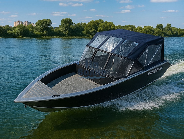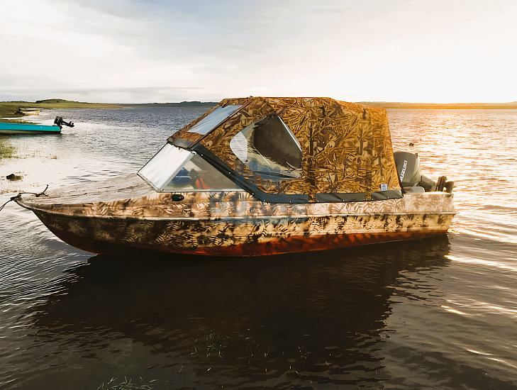 Тент с задней дверью для выхода к мотору, небольшими боковыми окнами и усиленными краями для установки застёжек. Изготовлен из специализированной тентовой ткани Оксфорд 600 повышенной плотности